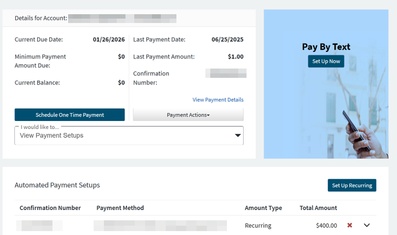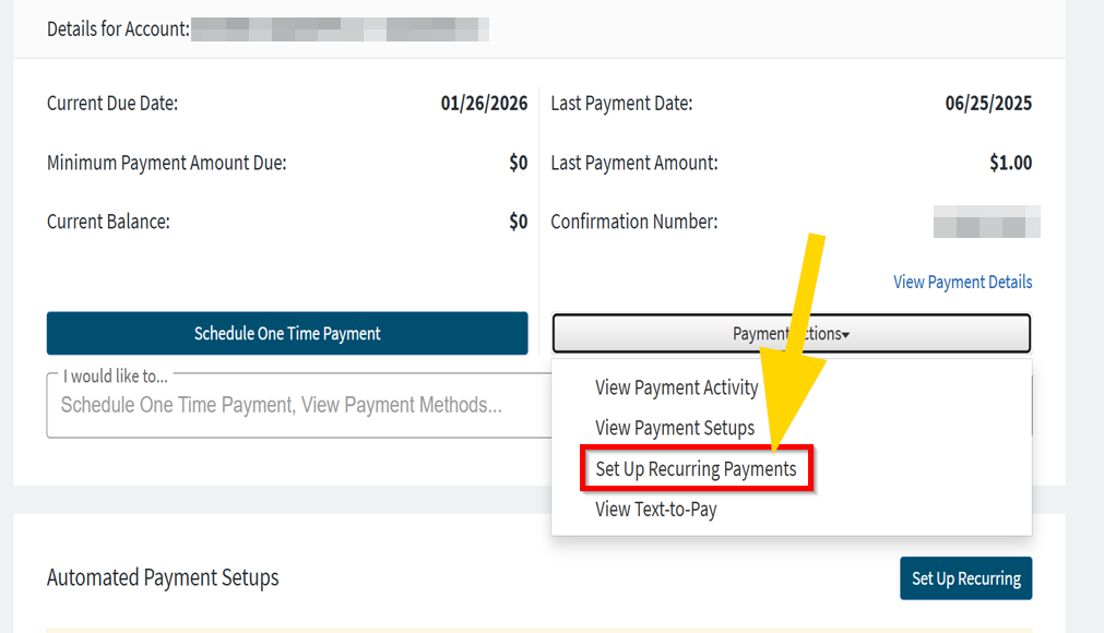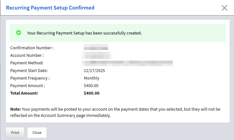 Your recurring payment has been successfully created! Going forward, this information will be displayed and can be managed using the Payment Actions menu.