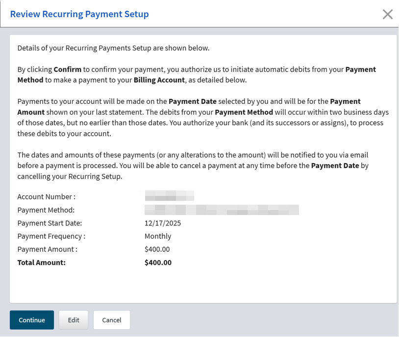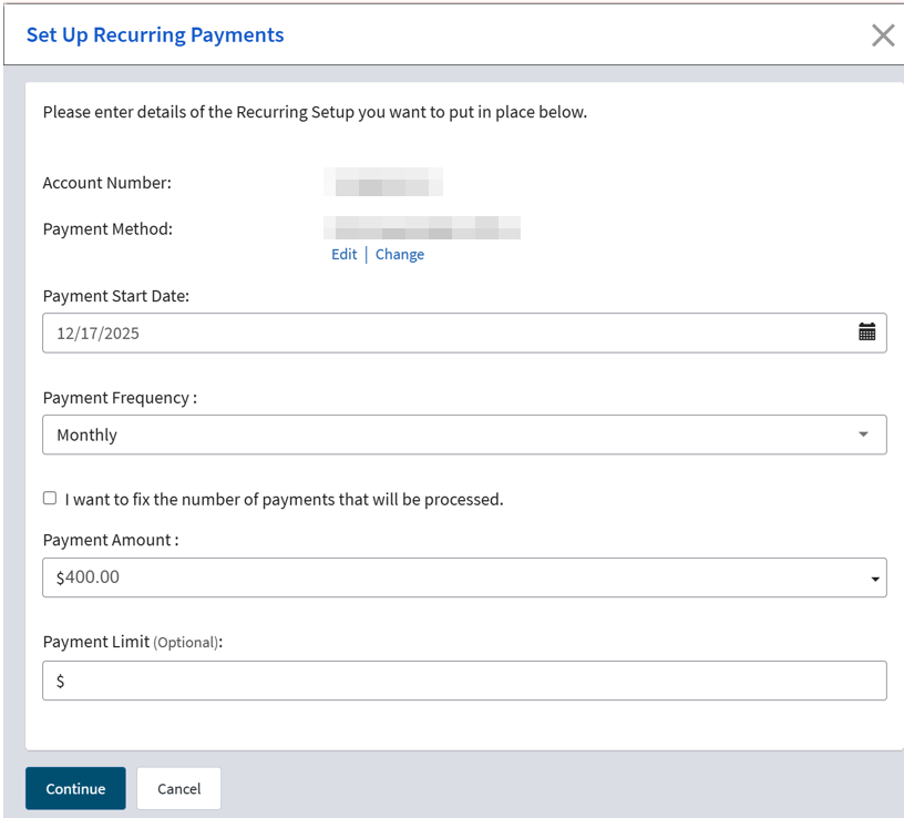 Enter the Payment Start Date, Payment Frequency and Payment Amount, then click Continue.