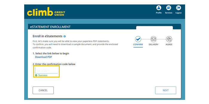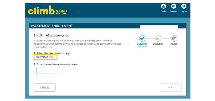 In order to sign up, you will need to download a sample document and provide the enclosed confirmation code. On the eStatements Enrollment screen, click Download PDF.